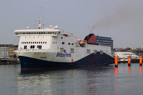 Ci-contre, l'Etretat, alors sous le nom de Norman Voyageur lors de ses années à relier Cherbourg à Rosslare.