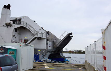 Le Normandie Express quittant Le Havre le 27 mars 2021 en arborant une livrée avec laquelle il n'aura jamais navigué.